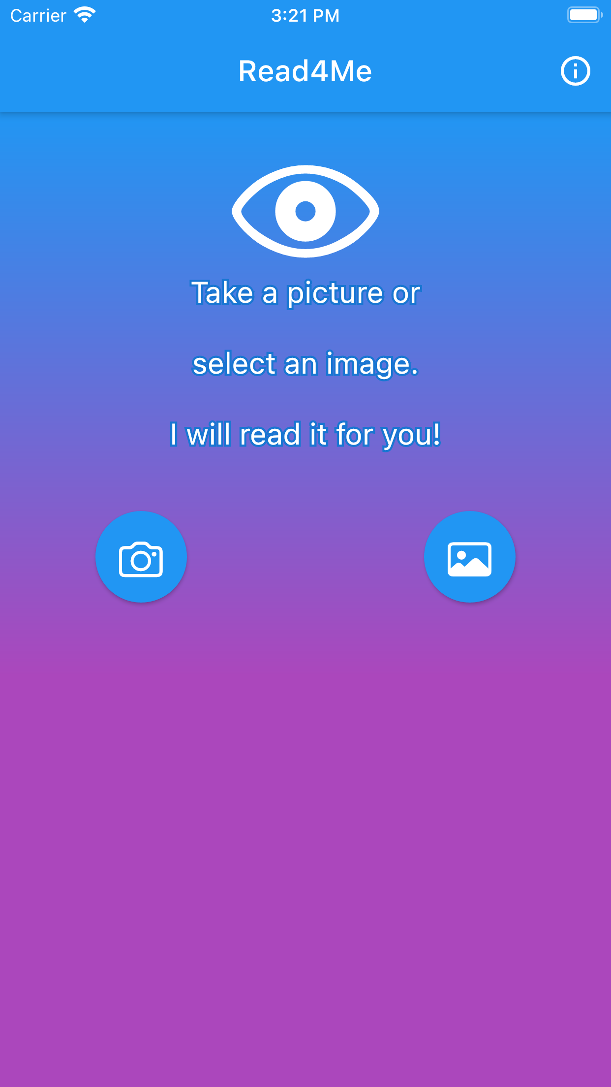 The Read4Me is an app that recognizes text of images. So the first thing you need is to pick up an image from your gallery or take a picture with your camera. In the picture below the app offers you these two possibilities.