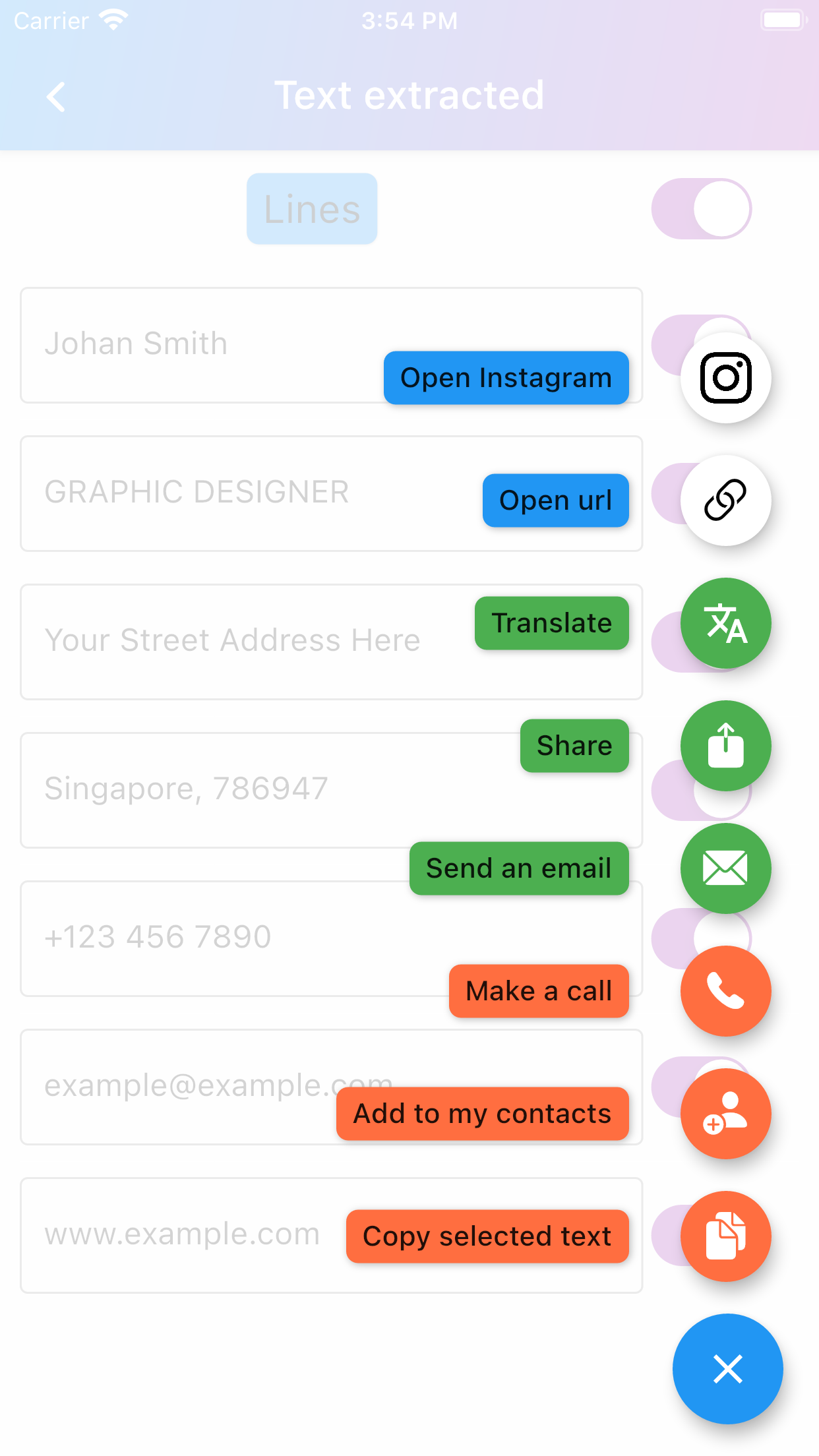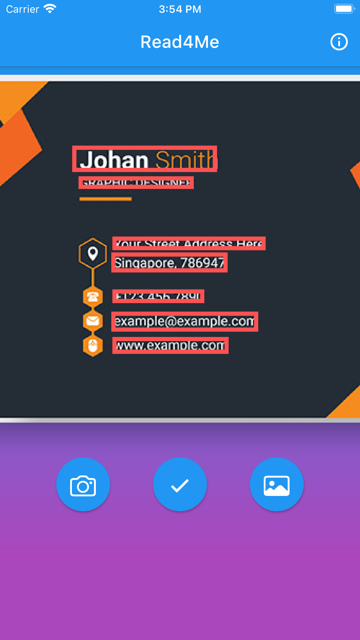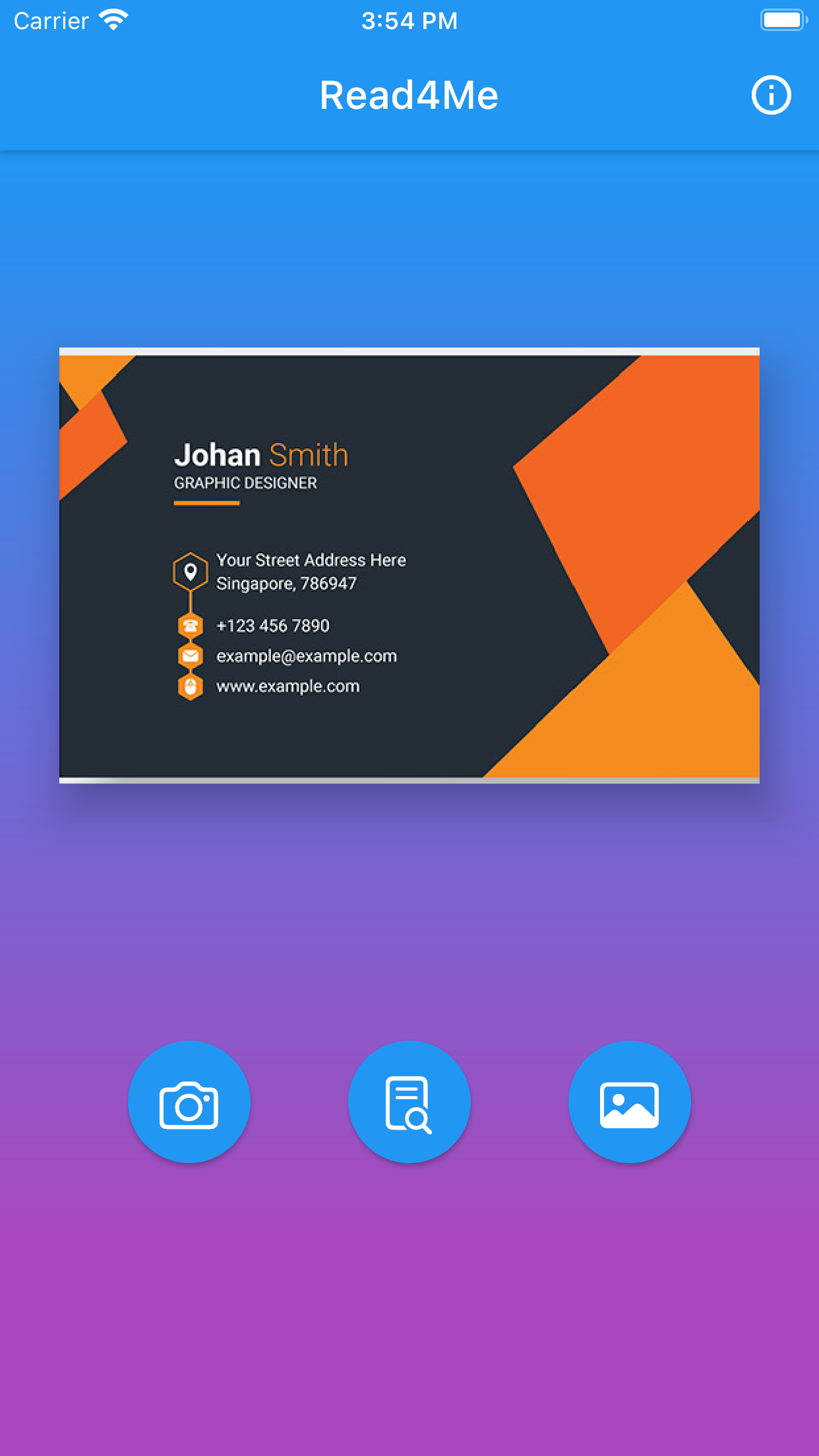 Suppose (in the next window) you have picked up a business card image you have received from a friend. If you push the button in the middle, the app will try to recognize the text on that image.