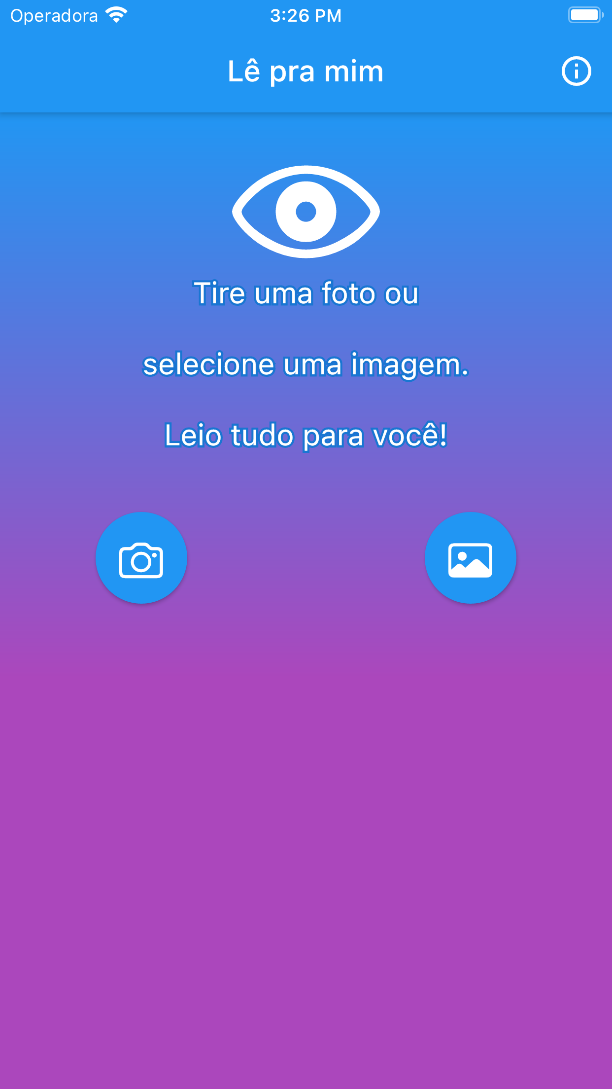 O LePraMim é um aplicativo que reconhece texto de imagens. Portanto, a primeira coisa que você precisa é escolher uma imagem de sua galeria ou tirar uma foto com sua câmera. Na imagem abaixo, o aplicativo oferece essas duas possibilidades.
