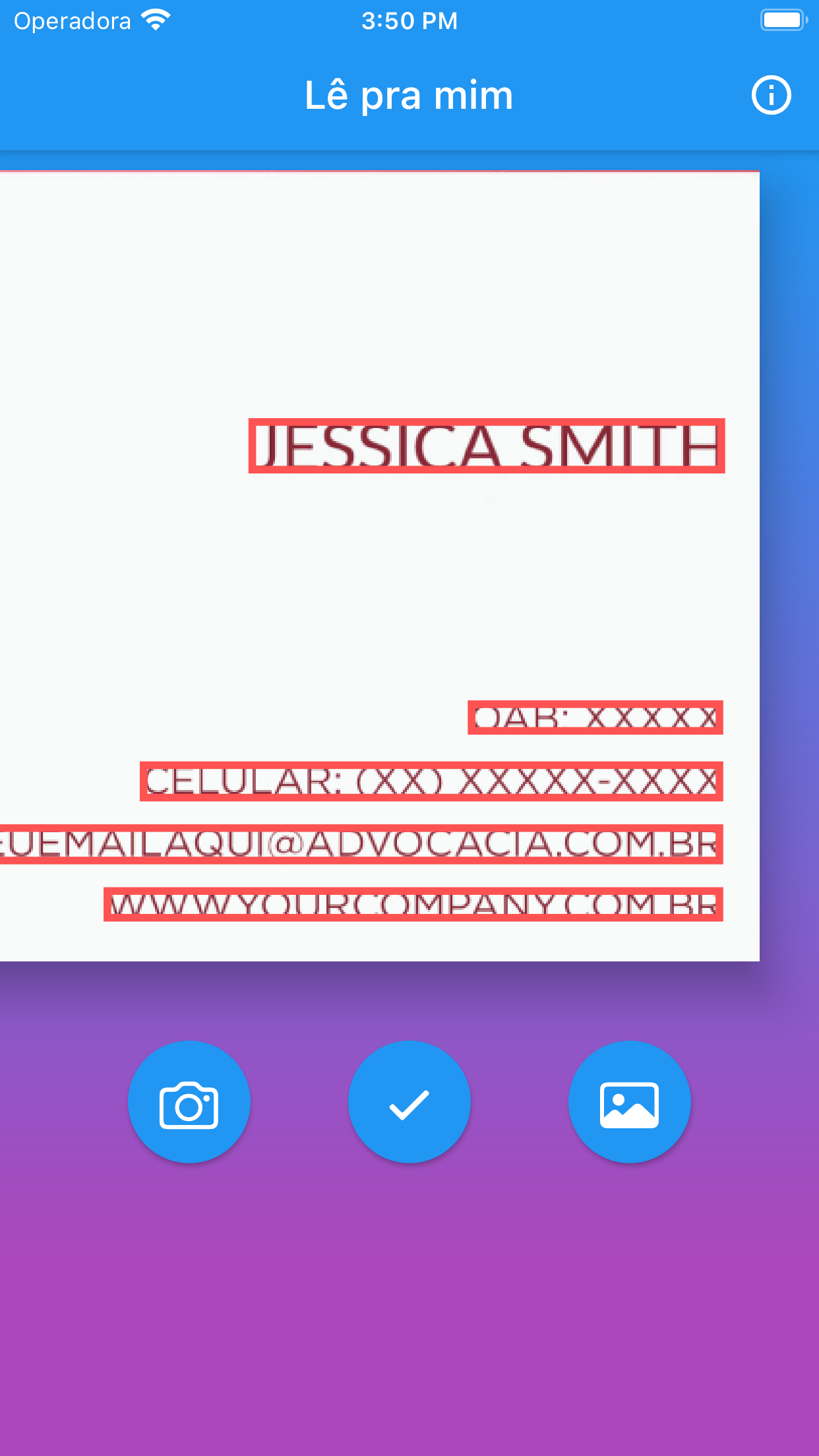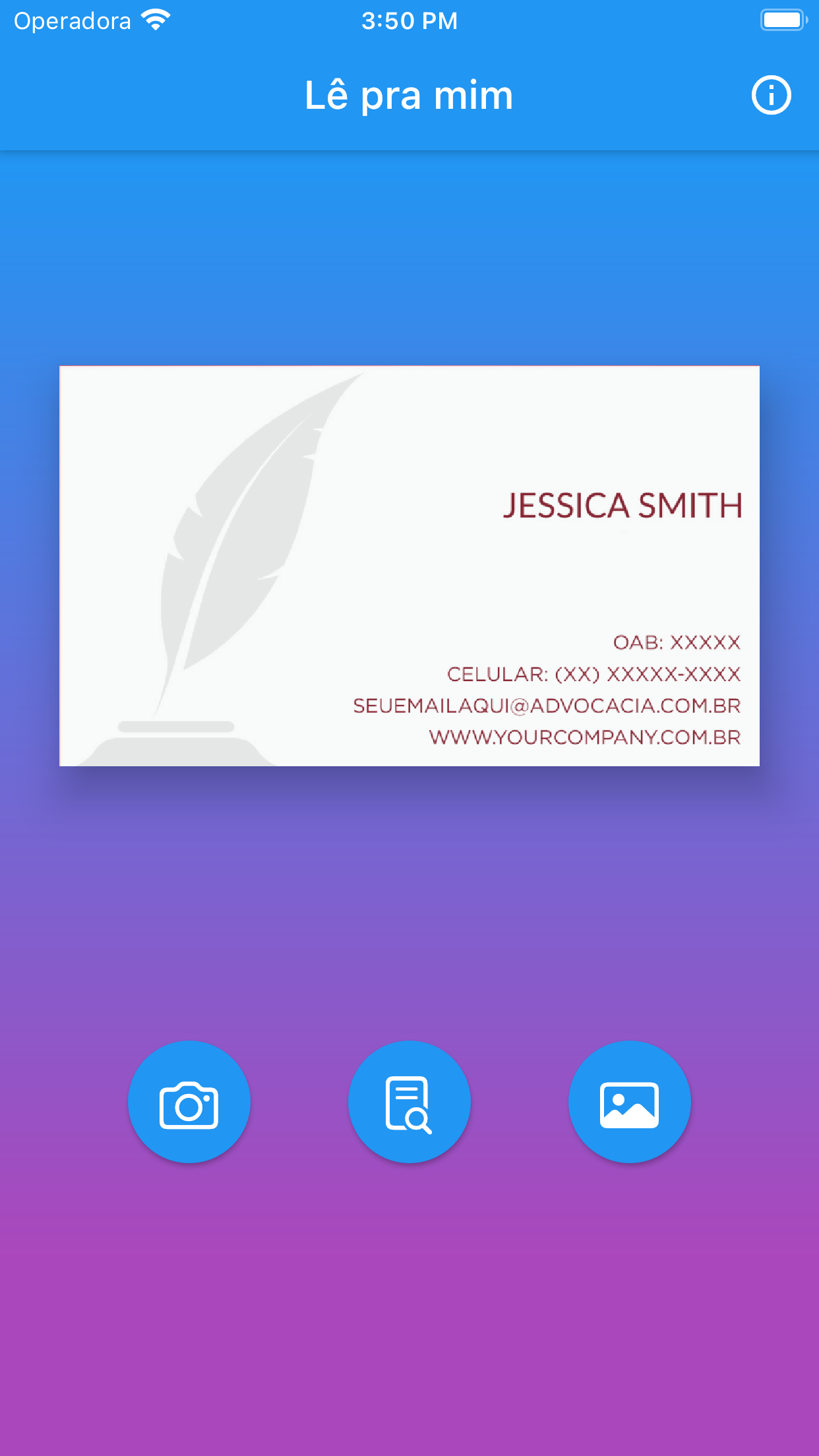 Suponha (na próxima tela) que você selecionou uma imagem de cartão de visita que recebeu de um amigo. Se você apertar o botão do meio, o aplicativo tentará reconhecer o texto dessa imagem.
