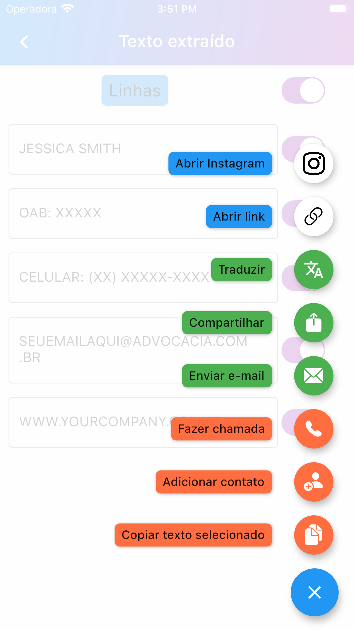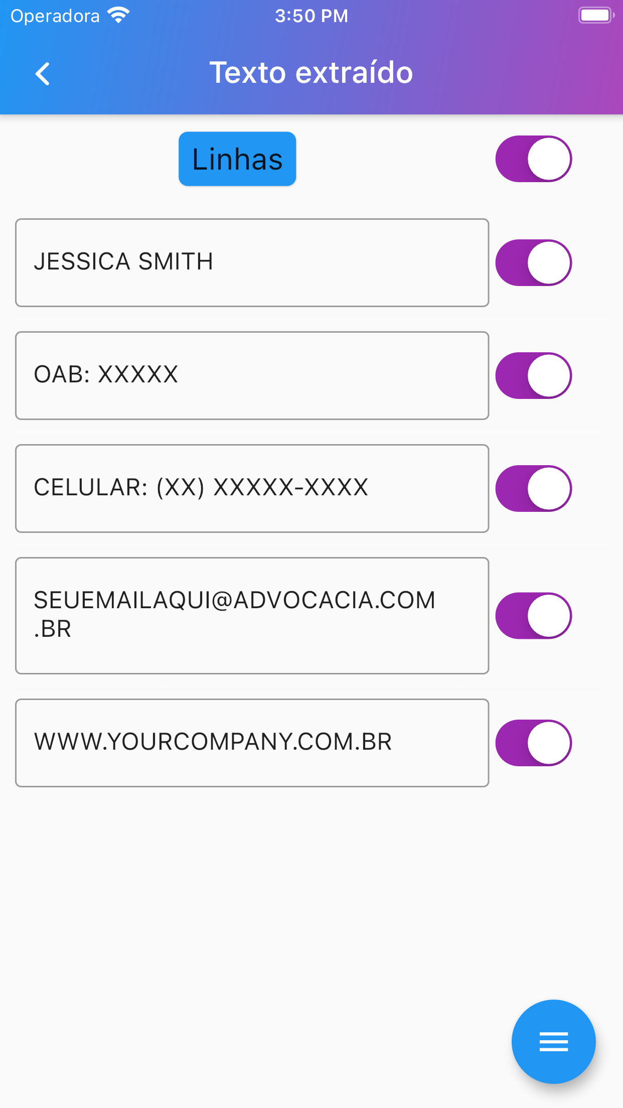 The next screen shows the text recognized in the previous step separate in editable lines. Now you check the extracted text, correct it, if necessary, and go back to the previous screen how many times you want without losing your editions. After your editions, you can mark the text you want to work, by checking the selector on the right of each line.